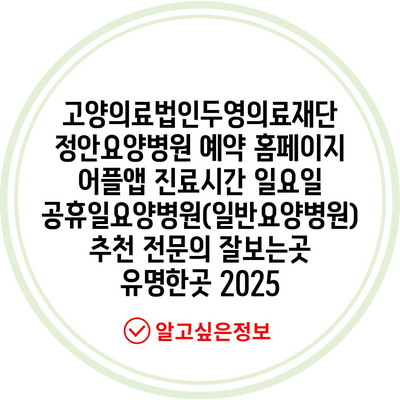 고양의료법인 두영의료재단 정안요양병원의 예약 홈페이지는 환자와 가족의 편의를 위해 신속하고 쉽게 방문할 수 있도록 구성되어 있습니다. 특히, 일요일과 공휴일에도 운영되는 이 요양병원은 환자들이 필요한 진료를 받기 위해 유연한 시간을 알려알려드리겠습니다.