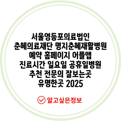 서울 영등포구에 위치한 춘혜의료재단 명지춘혜재활병원은 전문적인 재활 치료와 함께 다양한 진료 시간을 알려알려드리겠습니다. 이 병원은 특히 재활치료를 필요로 하는 환자들에게 높은 평가를 받고 있으며, 전연락들이 상주하여 최고의 진료를 제공하고 있습니다. 일요일 및 공휴일에도 환자들을 위한 진료 서비스를 알려드려 언제든지 편리한 시간에 방문할 수 있습니다.