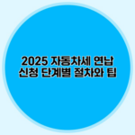 2025 자동차세 연납 신청 단계별 절차와 팁 2025년 자동차세 연납 신청은 세금을 절약할 수 있는 좋은 기회입니다. 이번 포스팅에서는 자동차세 연납 신청의 절차와 유용한 팁을 자세히 안내할게요. 자동차세를 빠르고 쉽게 신청하는 방법을 알아보도록 해요. ✅ 2025 자동차세 연납 신청을 쉽게…